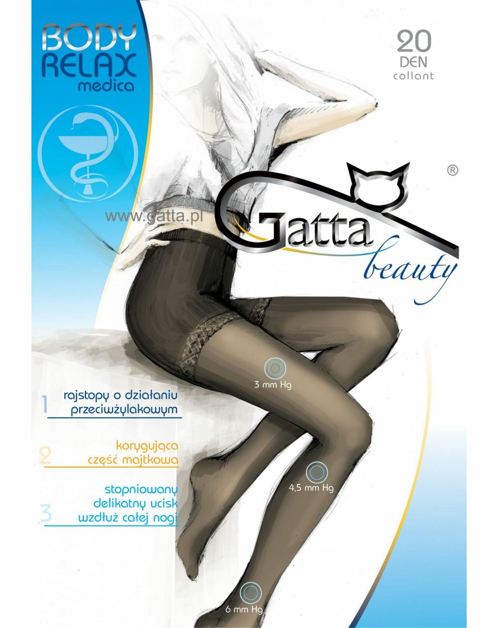 Anti-varicose tights, relaxing and correcting the figure. Semi-matte with gradual compression, with a shaping panties part. A special elastic band gently hugs the waist, does not curl and thus does not pinch. They facilitate proper blood circulation.